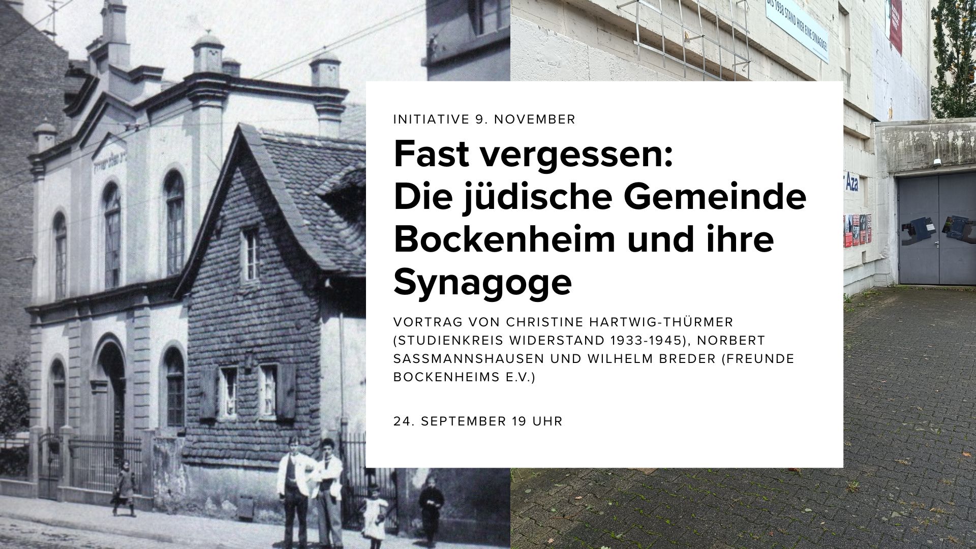 In Bockenheim gab es ab 1822 ein gleichberechtigtes Zusammenleben jüdischer und christlicher Deutscher mit völliger Gewerbefreiheit, einem Stadtrat sowie einem Bürgerausschuss. Ab 1933 wurden die Mitglieder der jüdischen Gemeinde ins Exil gedrängt oder ermordet. Während der Pogromnacht wurde die Synagoge in Brand gesteckt. Dr. Jakob Horovitz, der letzte Rabbiner, wurde von der Gestapo zu Tode gefoltert. Heute erinnert hier nichts mehr an die jüdische Gemeinde. Lediglich für die Synagoge existiert eine Gedenkplatte.